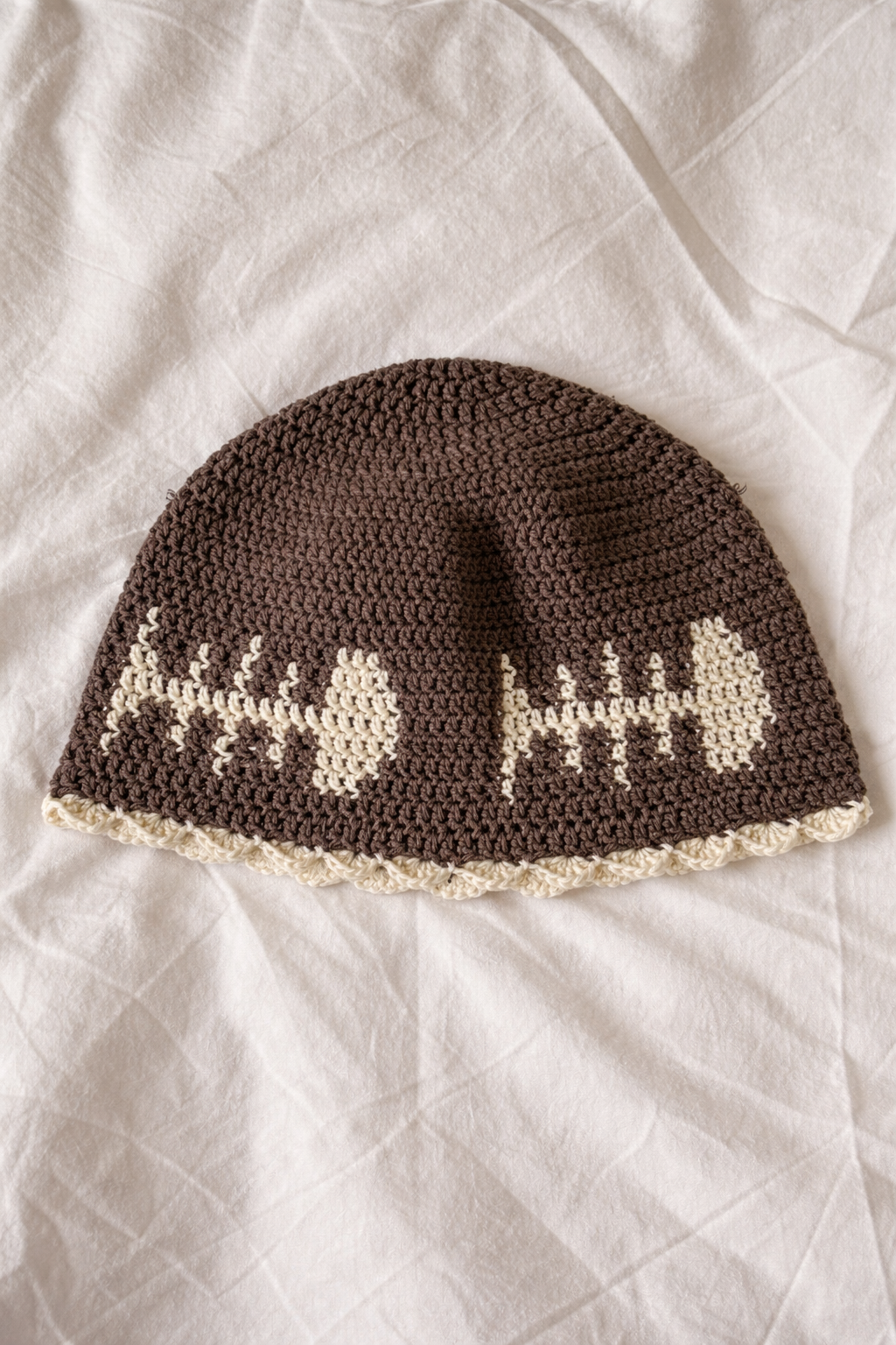 Handcrafted beanie made from soft, breathable 100% cotton. Features a unique pattern and an cute brim that adds a charming touch. Designed to suit all seasons.