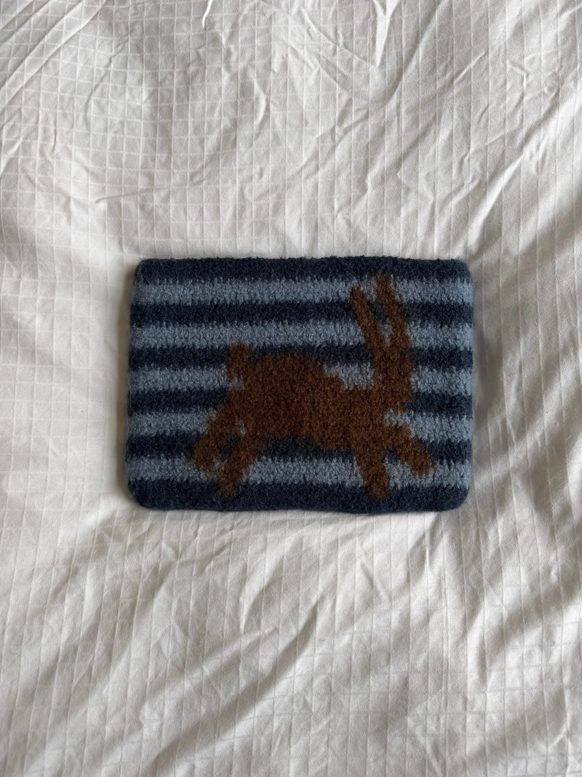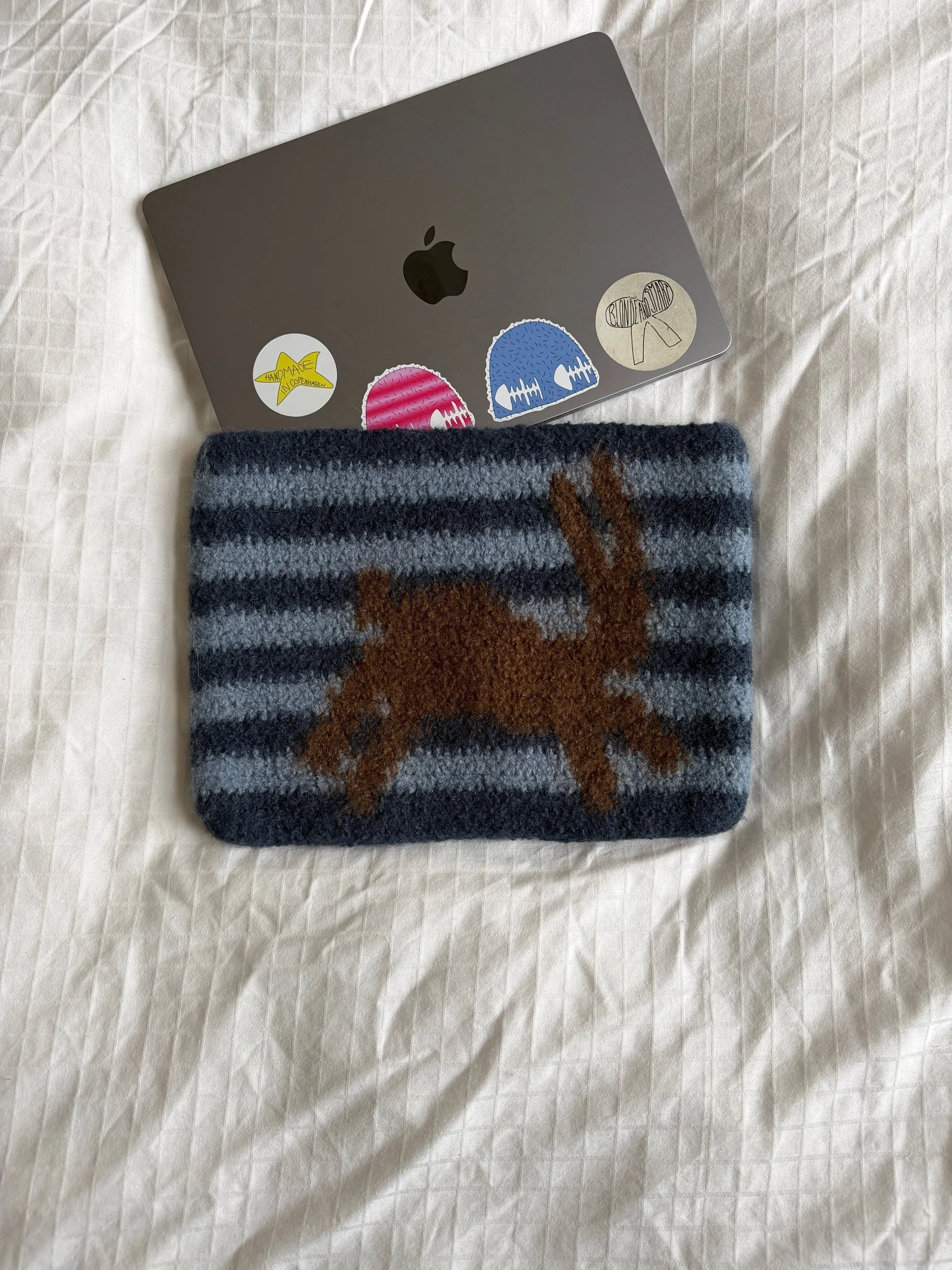 Handmade crochet computer case crafted from 100% wool. This cute and unique case gently protects your laptop while adding a cozy, stylish touch. Personalize it with your initials — they will be hand-sewn on for an extra special feeling. Fits a MacBook 13-inch.