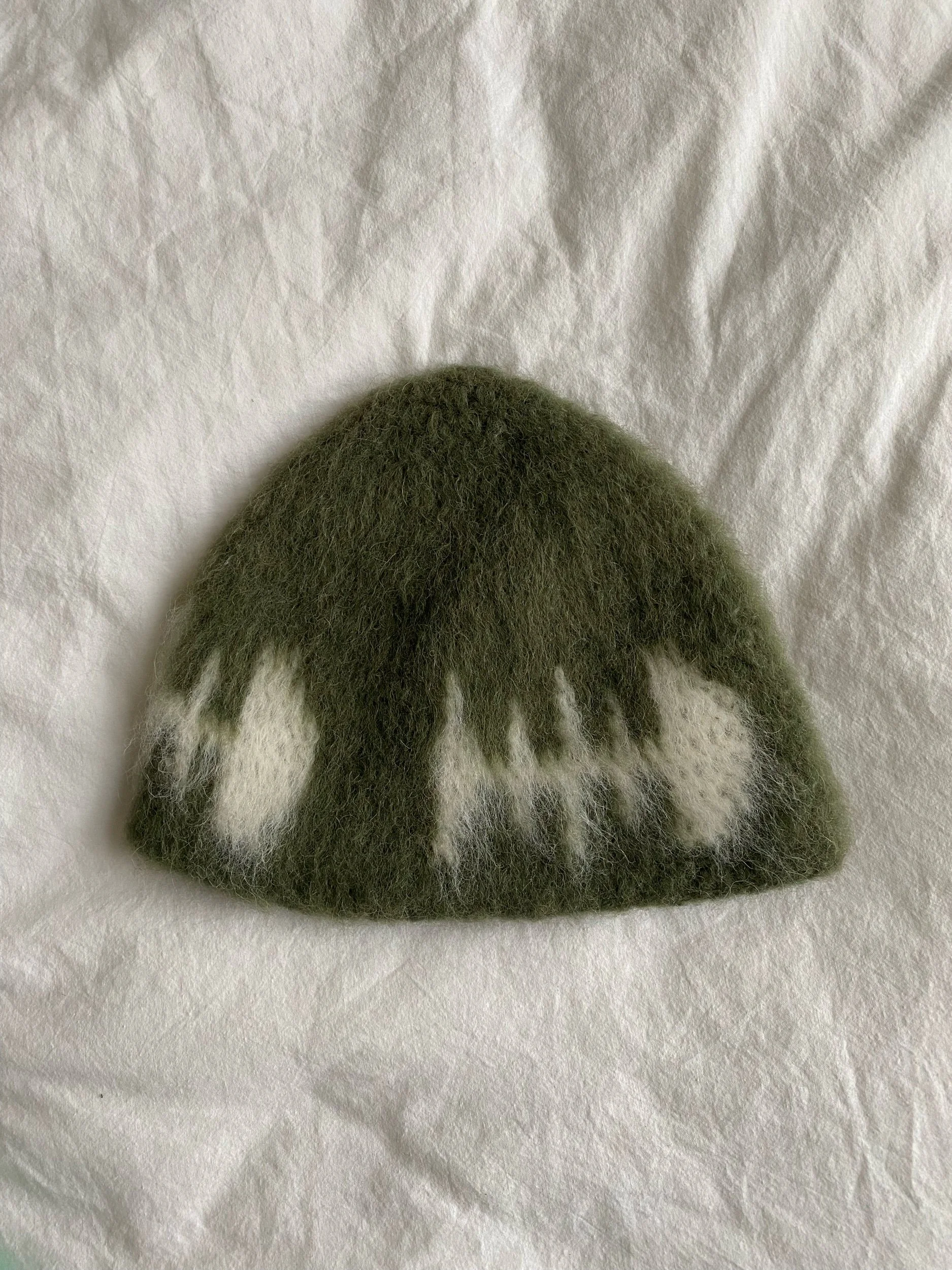 Dark green brushed fish bone beanie. The beanie is made from alpaca wool for warmth in cold weather. Its cozy brushed texture and unique fish bone design give it a fun touch. One size