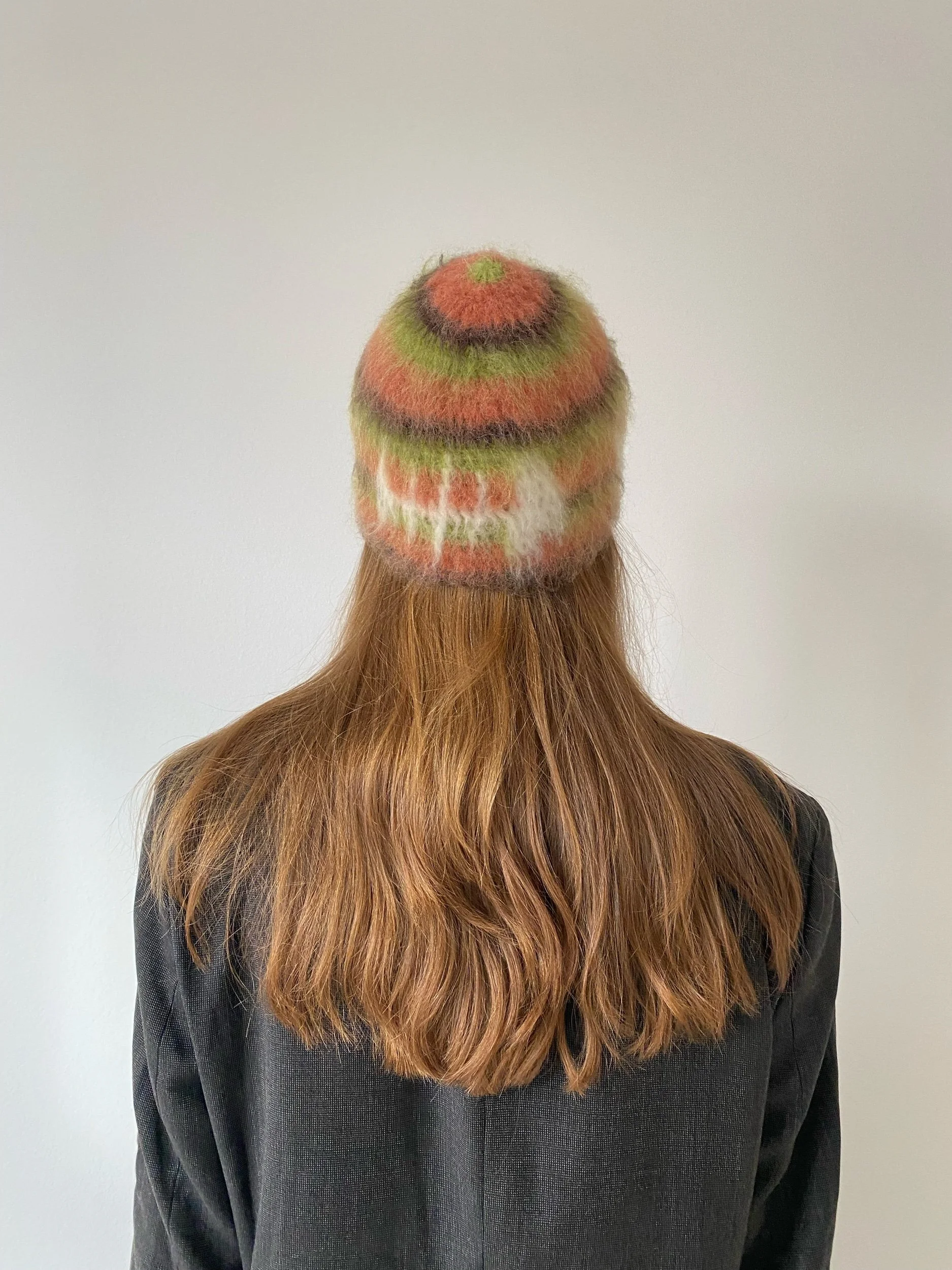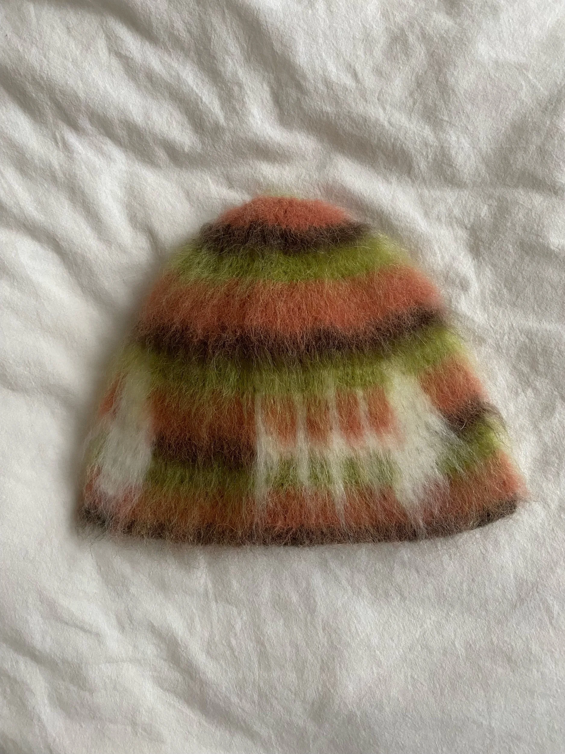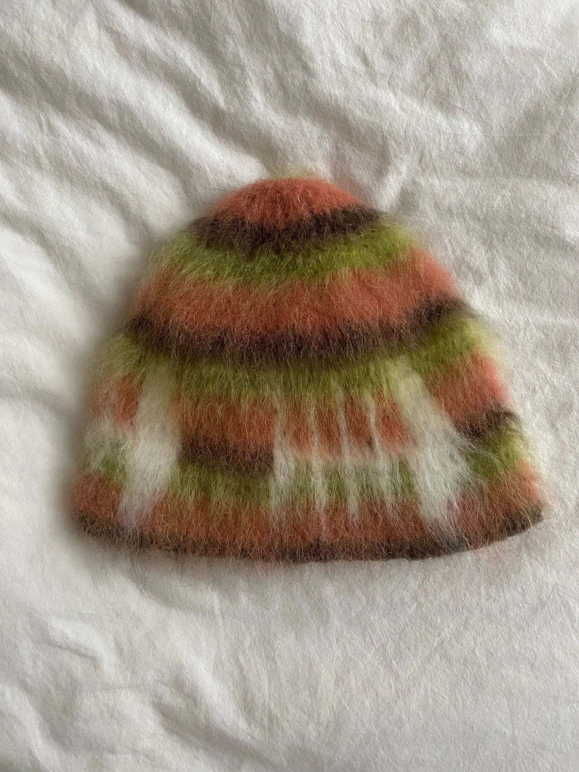 Multi-colored brushed fish bone beanie in green, orange and brown. The beanie is made from alpaca wool for warmth in cold weather. Its cozy brushed texture and unique fish bone design give it a fun touch. One size