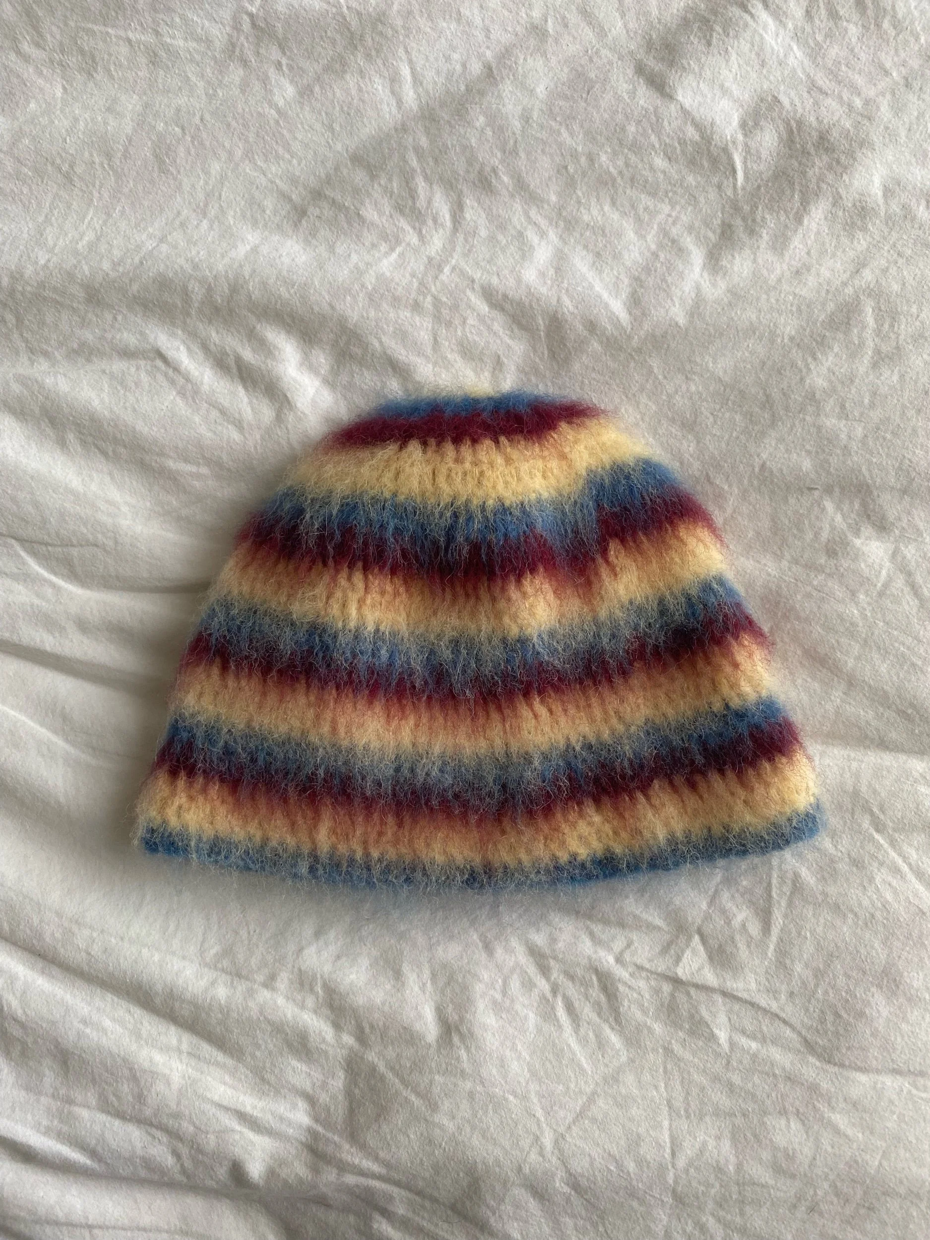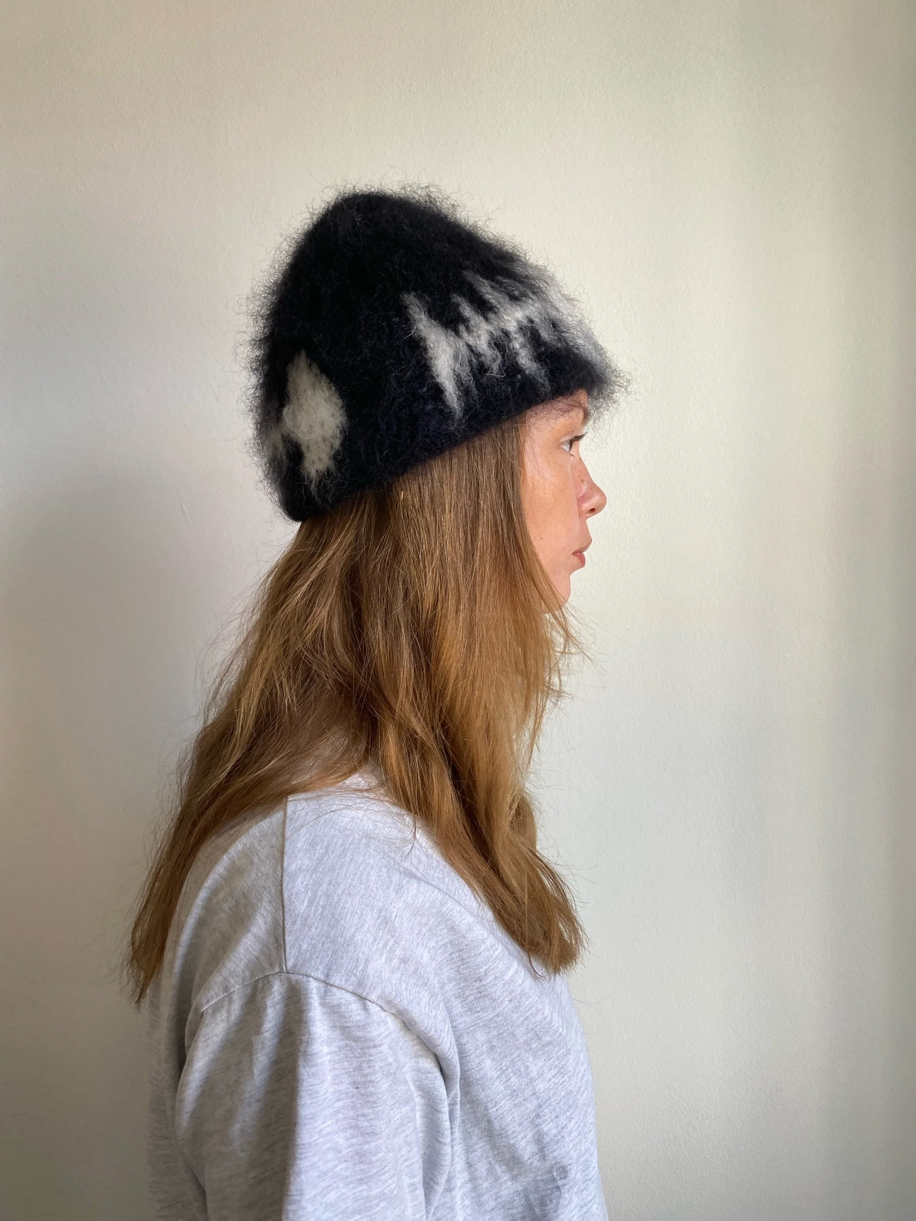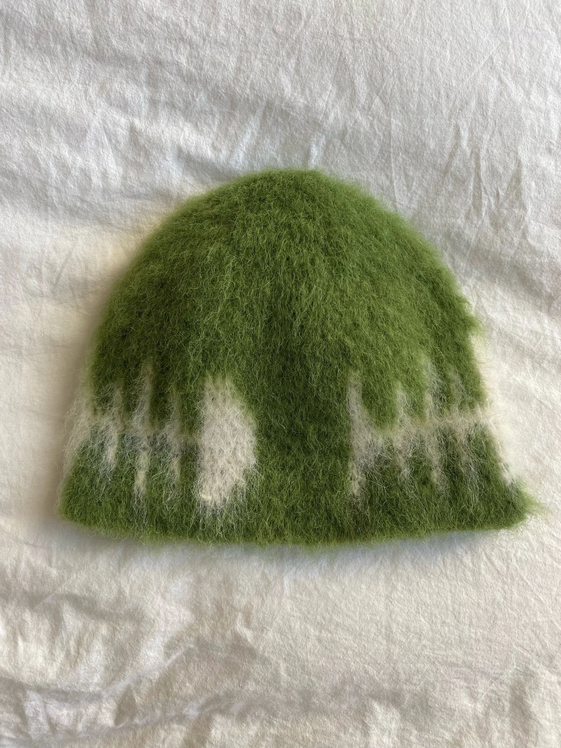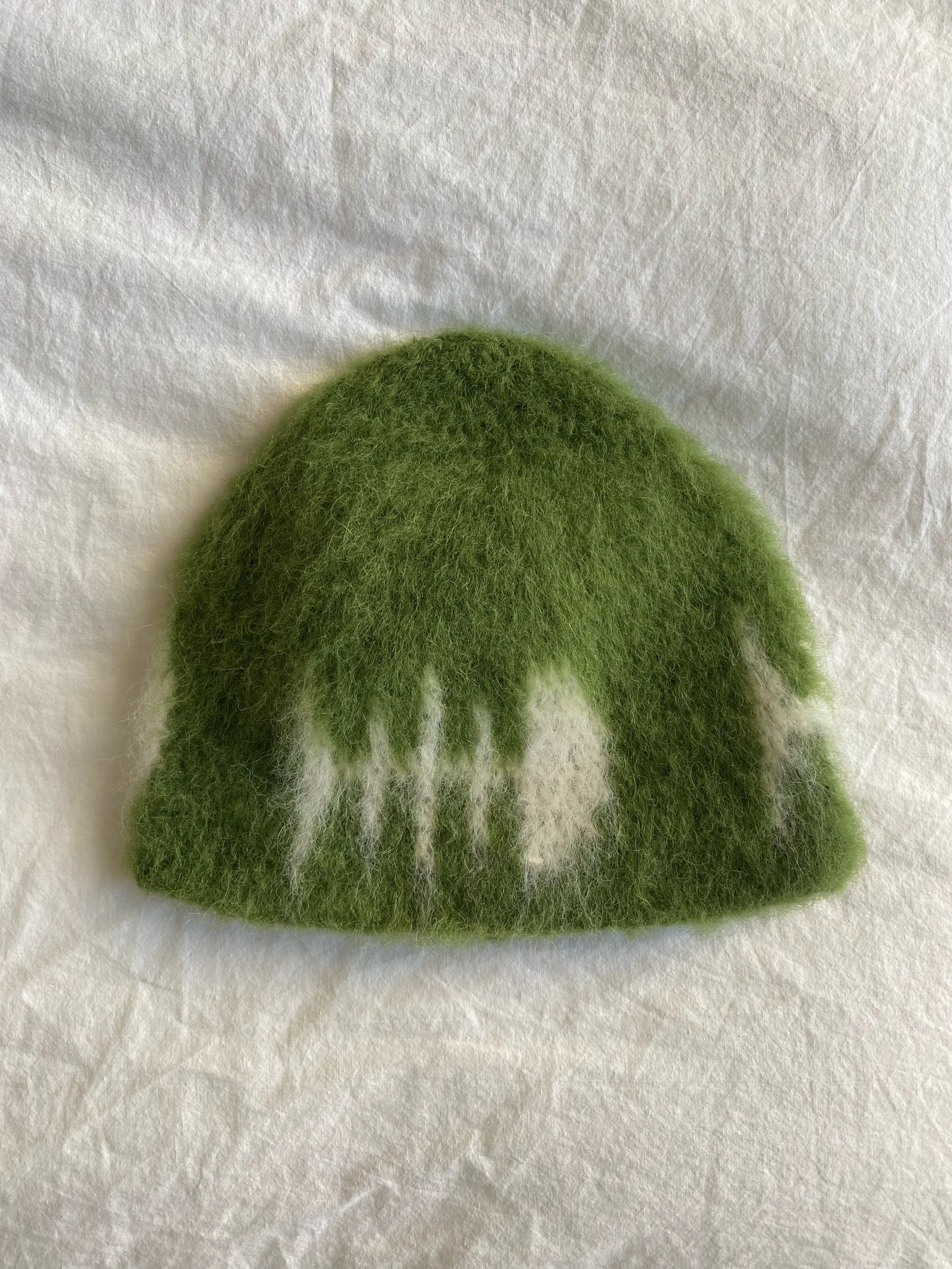 Green brushed fish bone beanie. The beanie is made from alpaca wool for warmth in cold weather. Its cozy brushed texture and unique fish bone design give it a fun touch. One size
