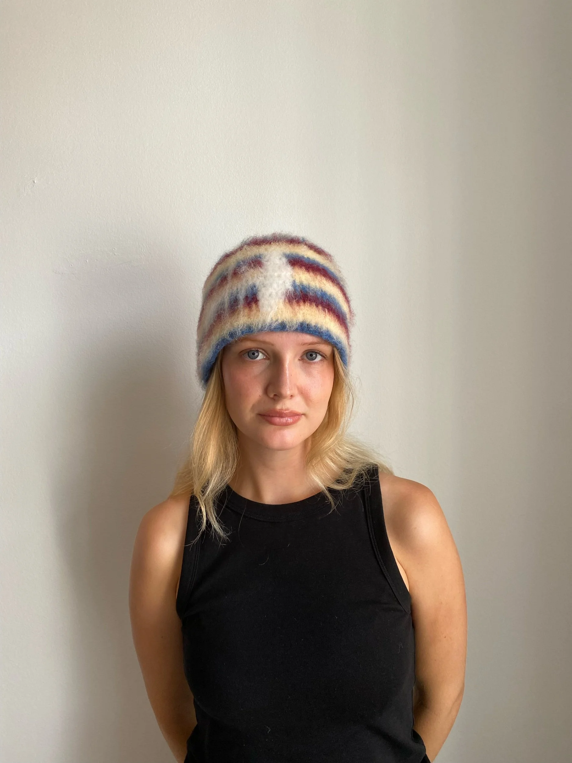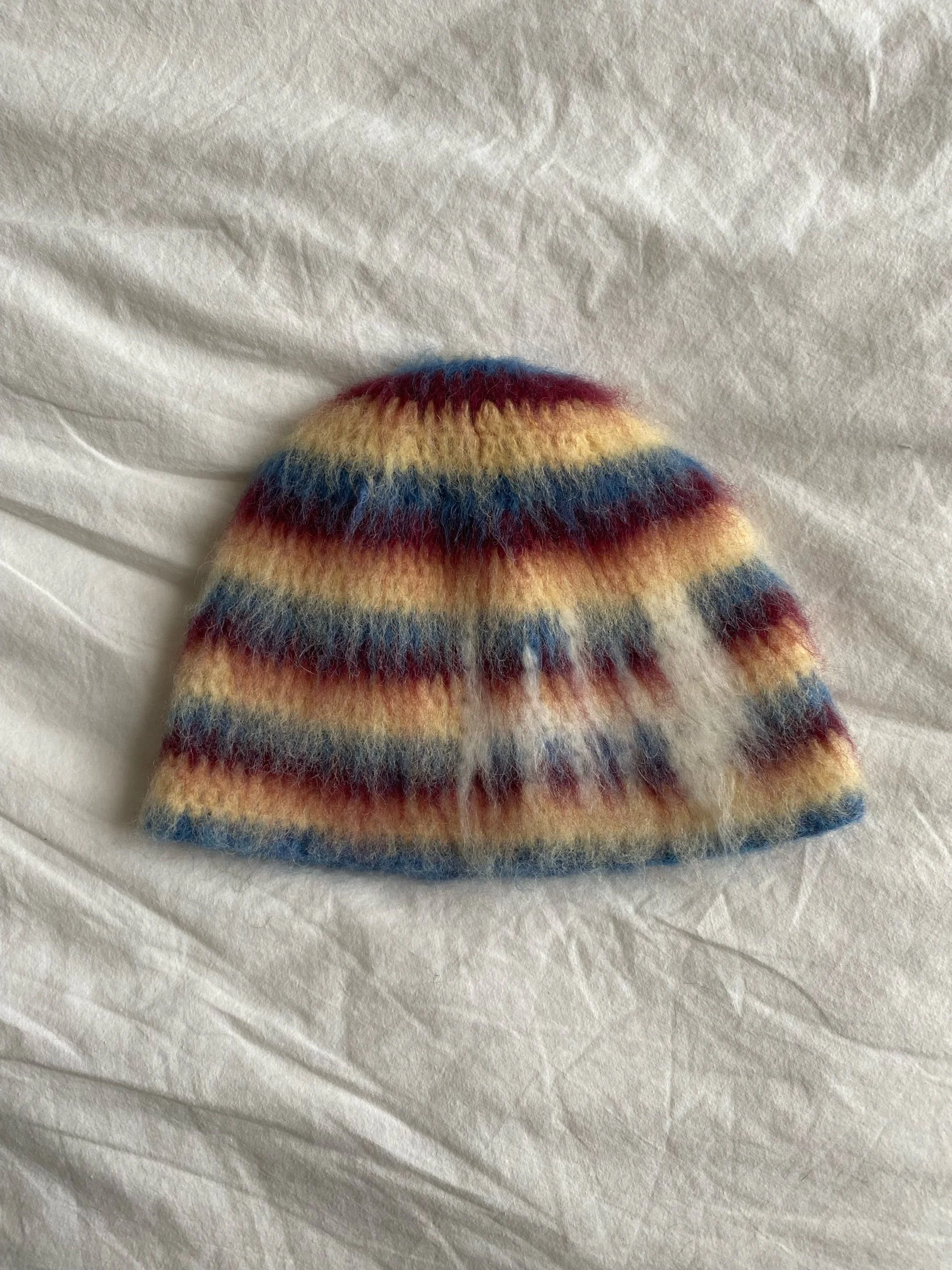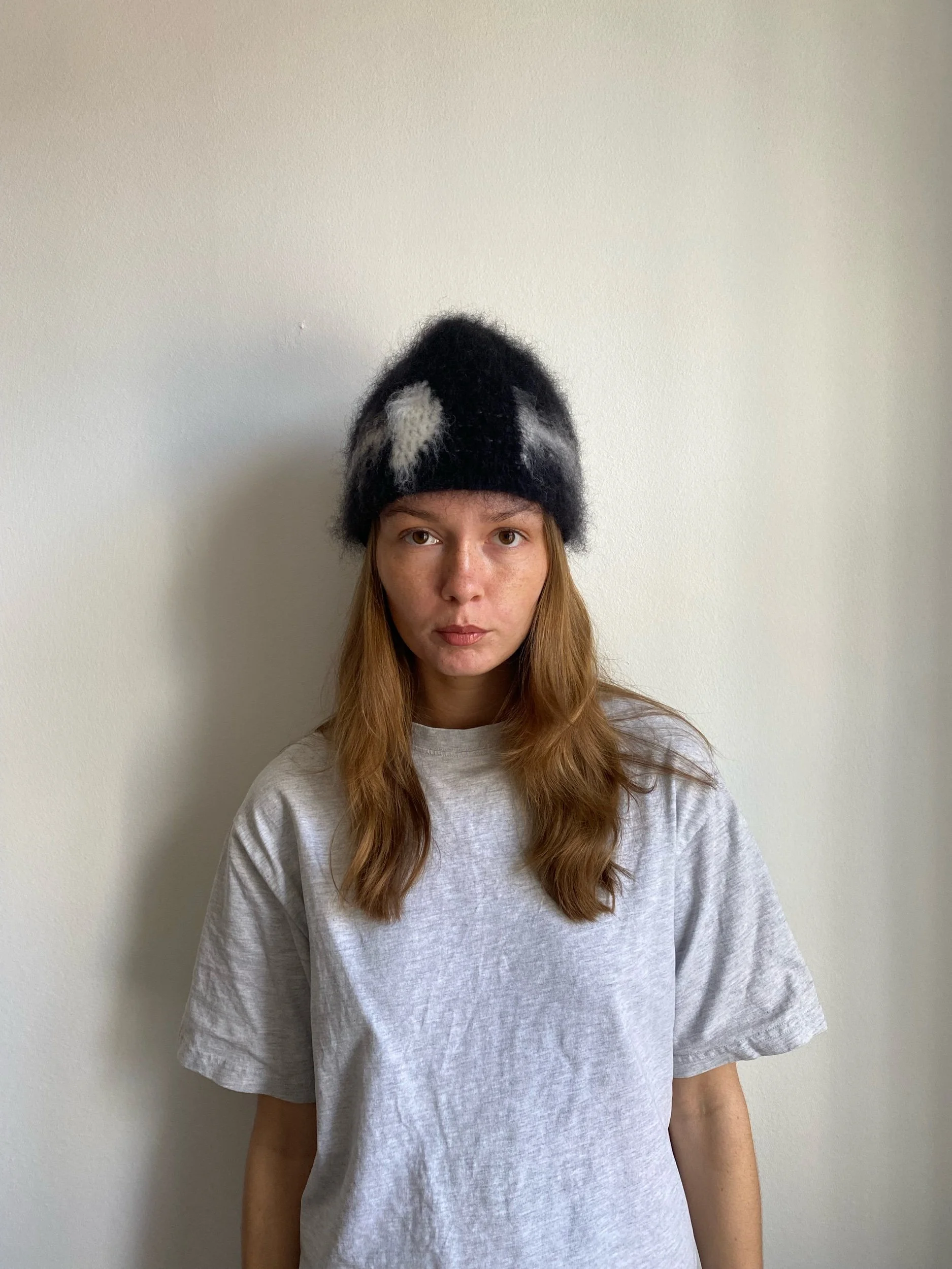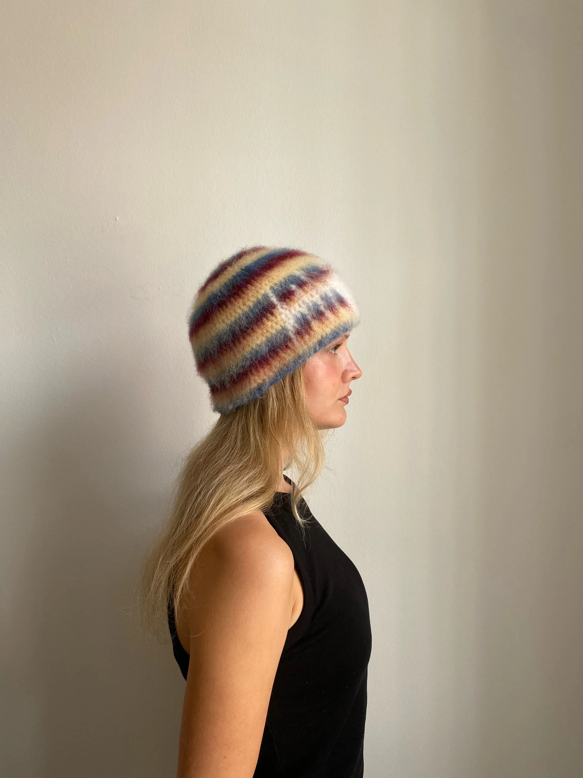 Green brushed fish bone beanie. The beanie is made from alpaca wool for warmth in cold weather. Its cozy brushed texture and unique fish bone design give it a fun touch. One size