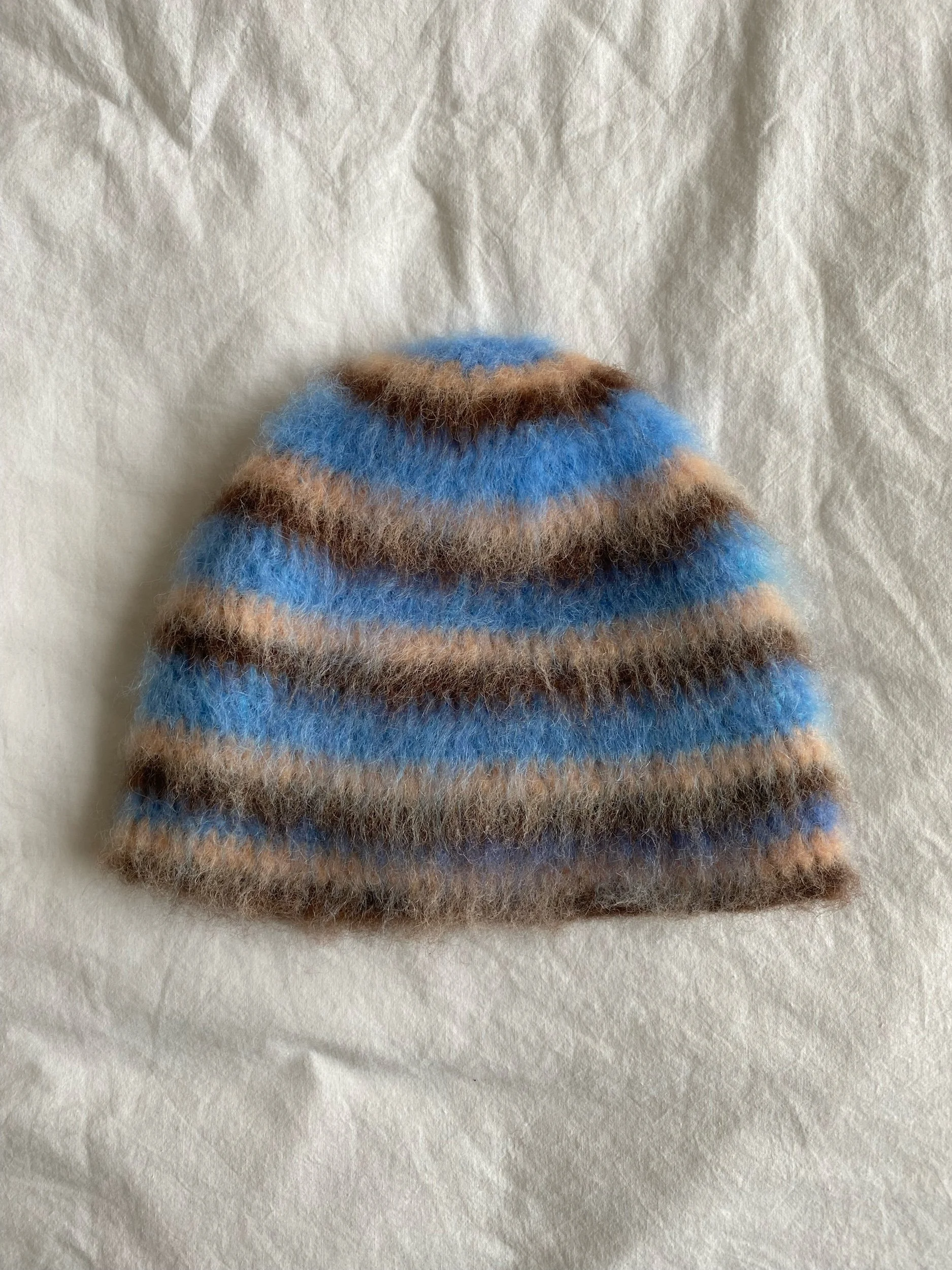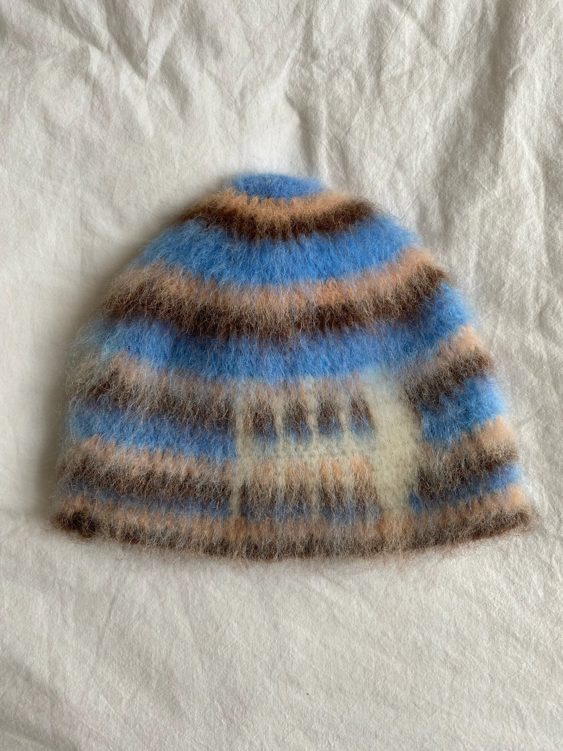 Multi-colored brushed fish bone beanie. The beanie is made from alpaca wool for warmth in cold weather. Its cozy brushed texture and unique fish bone design give it a fun touch. One size